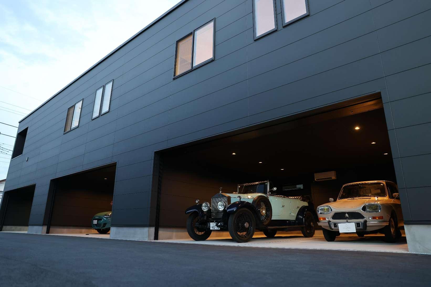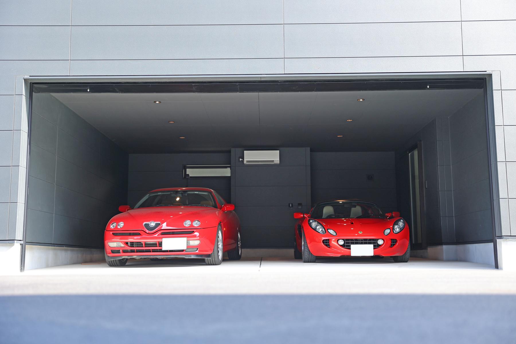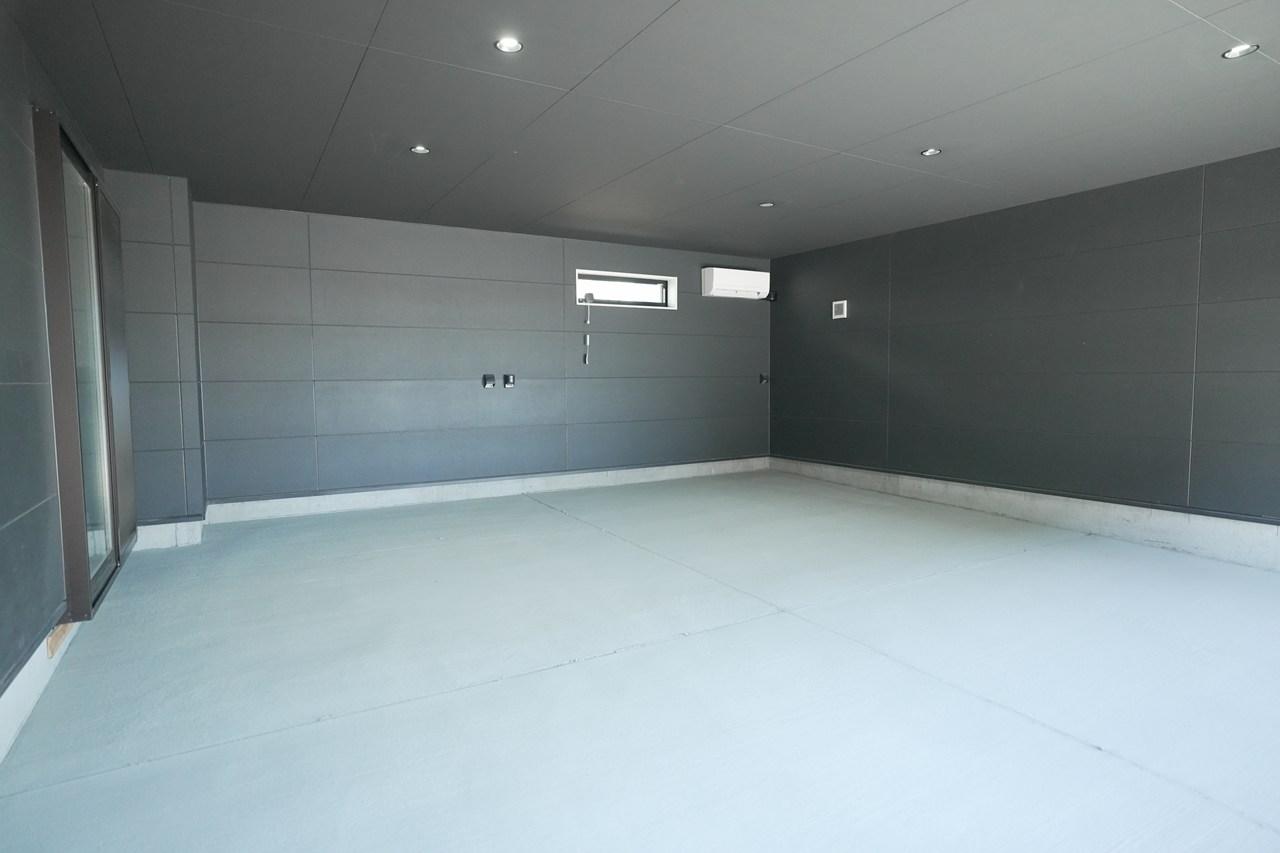 シャッターにはハイスピードタイプを採用。開口部は幅5,942mm、高さ2,350mmというハイスペック仕様です。大型車でもストレスなくスムーズに入出庫を可能にするこのハイスピードシャッターの機能と静かさが、早朝や深夜のホビータイムを可能にし、居住空間や近隣への配慮も万全です。強固な構造が、高価な愛車や大切なツール類を外部の不安から守り抜き 、「秘密基地」としての安心感を保証します。